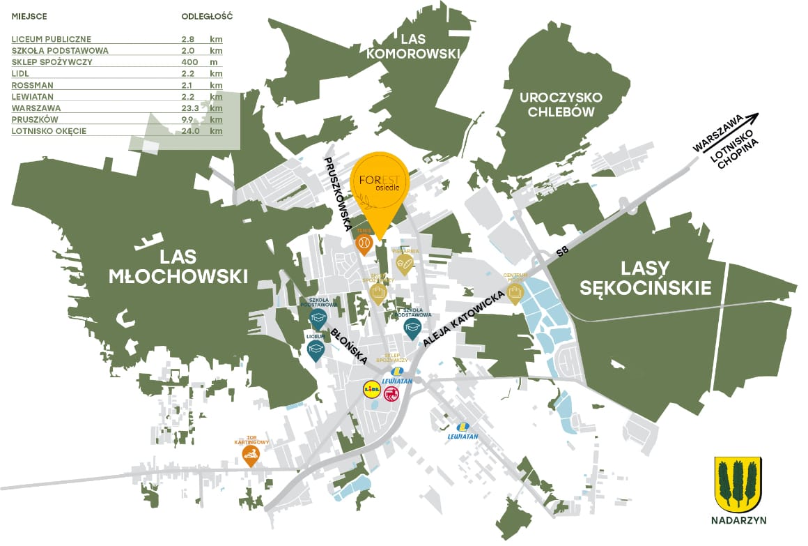 Forest Osiedle znajduje się w Nadarzynie, który jest świetnie skomunikowany z Warszawą i Jankami. Dzięki dogodnej lokalizacji szybko dojedziesz do pracy, a po niej zrobisz zakupy w sklepach i centrach handlowych oraz skorzystasz z zaplecza usługowego Janek – restauracji czy kina.